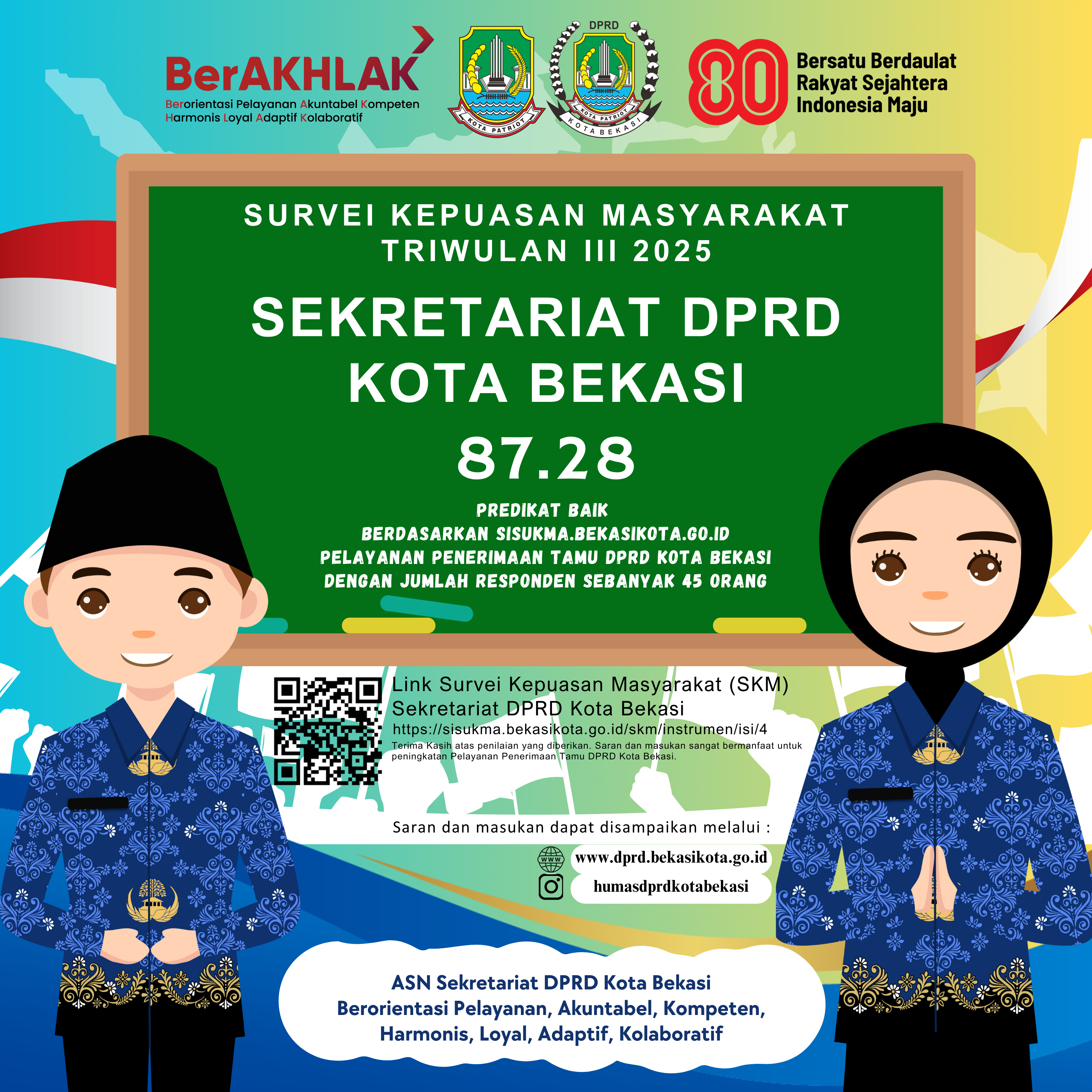 Sekretariat DPRD Kota Bekasi memperoleh Indeks Kepuasan Masyarakat (IKM) sebesar 87.28 dengan kategori mutu pelayanan B “Baik”, berdasarkan sisukma.bekasikota.go.id.